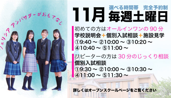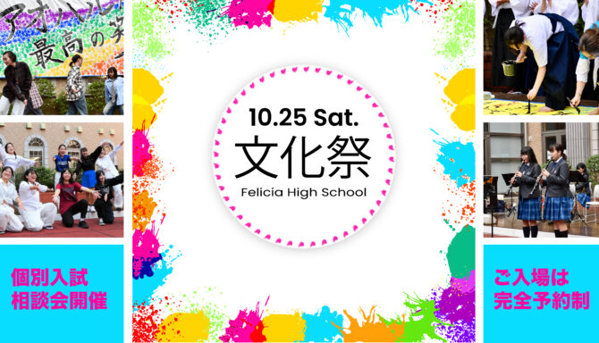 満席のお知らせ。10月25日(土)文化祭での個別入試相談会は満席です。文化祭のみの参加は可能です。リピーターさんは11月から毎週土曜日開催されるリピーターさん専用個別入試相談会をご利用ください。初めての方は11月から毎週土曜日開催の学校見学会(説明会+個別入試相談+施設見学)をご利用ください。