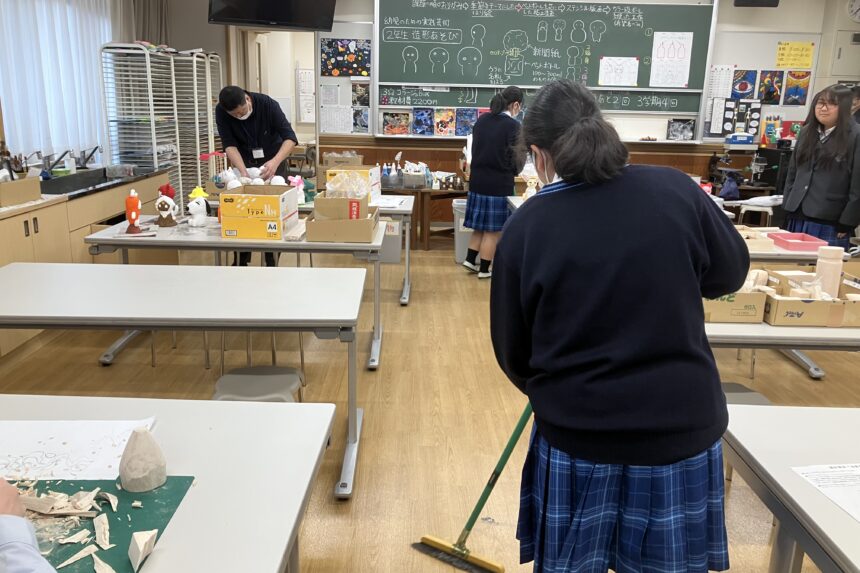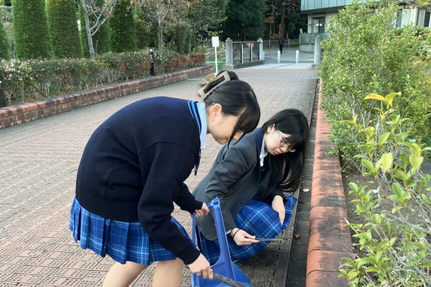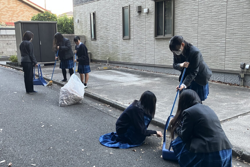 2025.11.21秋の美化活動の報告!11月19日(水)放課後、美化委員有志による第4回美化活動を実施しました。今回はあじさい門・しらゆり門周辺の落ち葉の清掃および美術室の清掃。たくさんの落ち葉をかき集めてきれいにした通路は、秋晴れの中、輝いていました。 美化委員会では今年度、美化啓蒙ポスターの作成と校内掲示、各教室の掃除用具の点検、文化祭の時の校内20カ所のゴミ箱の袋交換・ゴミ捨て、放課後の美化活動を行っています。