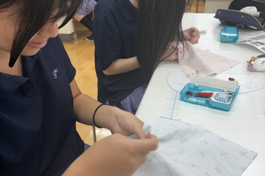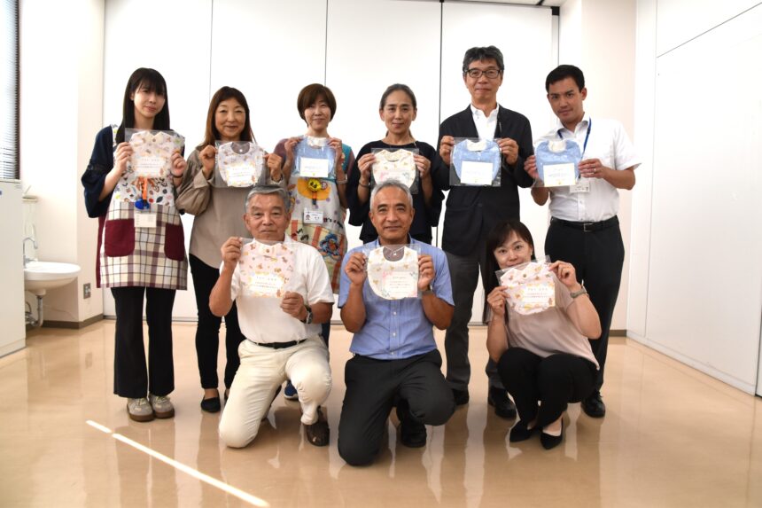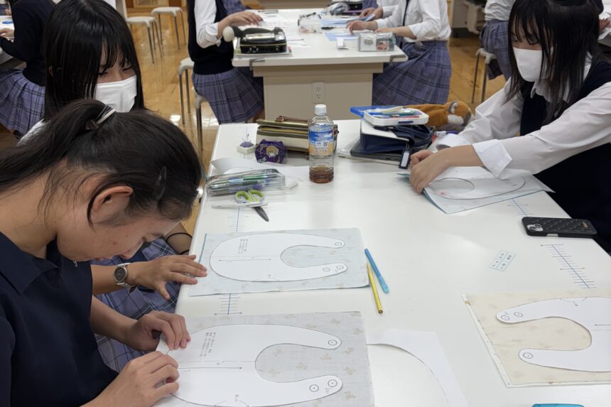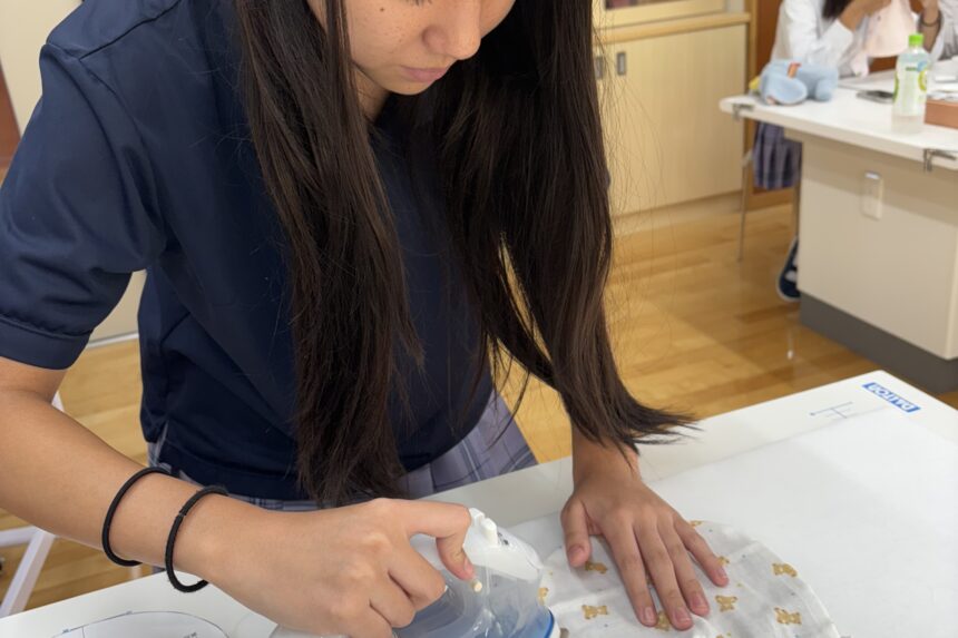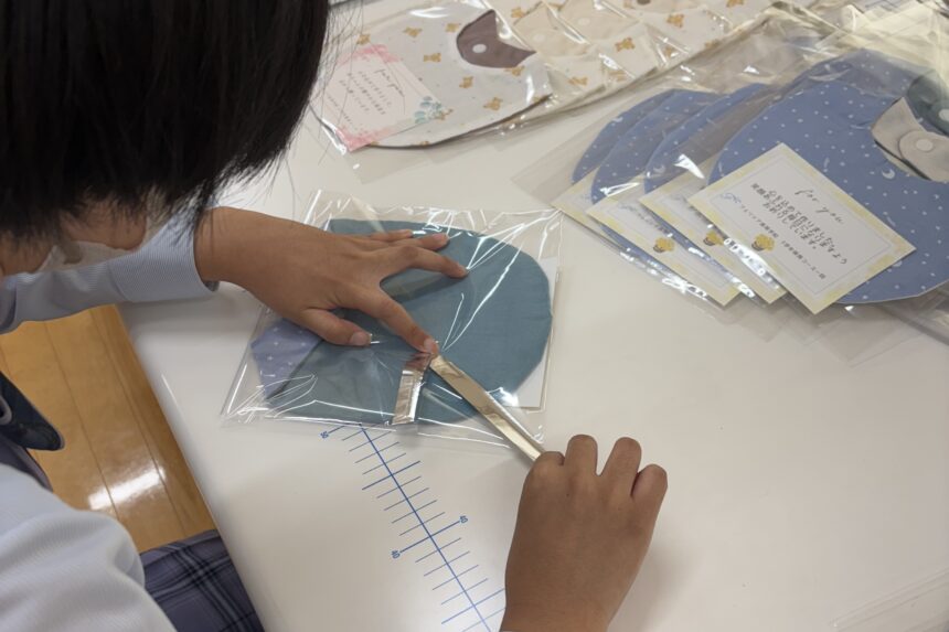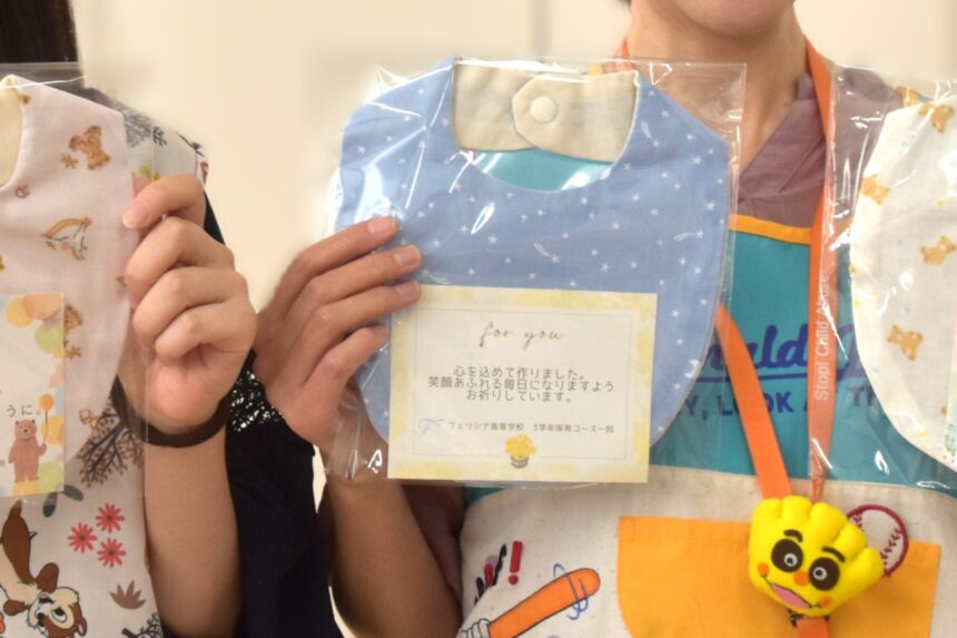 この温かな取り組みに、本校も協力させていただきました。保育基礎の授業の一環として、保育コース3年生が約4時間をかけ、80枚余りのベビースタイを一枚一枚丁寧に作成しました。裁断から手縫い、アイロンがけ、ボタン付け、ラッピングまでをすべて生徒自身で行い、安全のため検針もしっかりと実施しました。