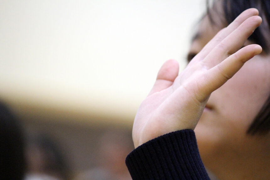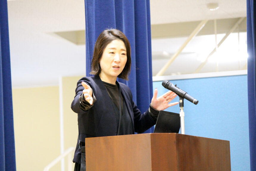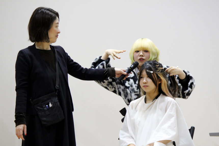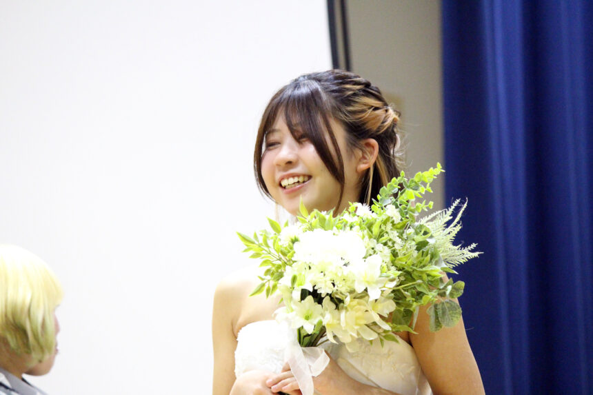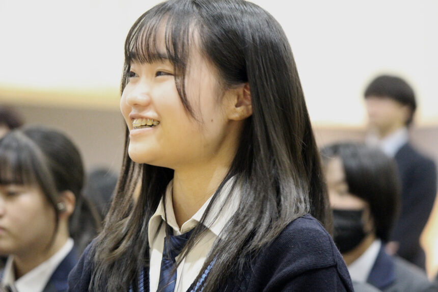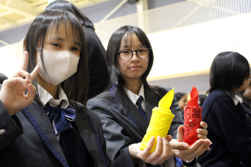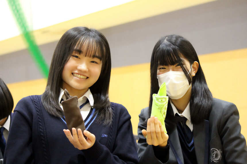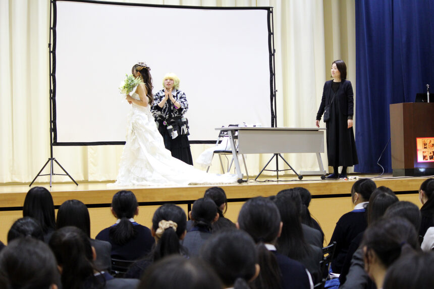 人生の最〝幸〟のときを創出するブライダル業界。11月21日(金)の出張講義は、東京ビューティー&ブライダル専門学校の先生・学生さんから、ウエディングプランナー、ブライダルヘアメイクの仕事を学びました。披露宴会場ではナフキンも大切な演出の一つ。円卓をケーキに見立てたロウソク、森をテーマにした披露宴ではウサギ。生徒は手持ちのハンカチを使って「作品」を仕上げていきました。そして学生さんによるブライダルヘアスタイルの実演。わずか10数分であでやかなヘアスタイルに。自分と数歳しか違わない学生さんの、見事な技術に惜しみない拍手が送られました。創意工夫とたゆまぬ研さんの先に、感動と喜びの共有がある。華やかな世界を支える確かなスキルに触れた1日でした。