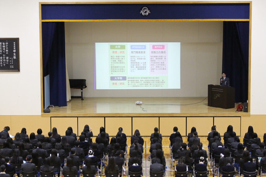 今年度6校目となる大学・専門学校出張講義が1月16日に開催されました。今回は日本で唯一「動物看護学部」を設置するヤマザキ動物看護大学。卒業生は国家資格「愛玩動物看護師」を取得し、研究職に就いたり、動物病院や成長著しいペット関連産業に従事したりと活躍しています。