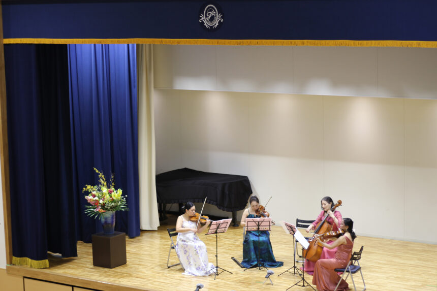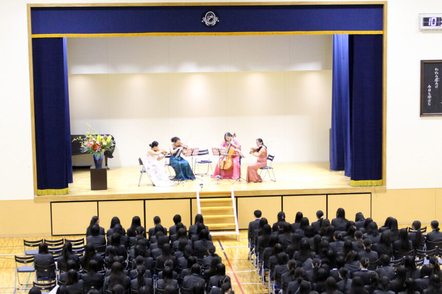 2月19日(木)に恒例の「卒業記念会コンサート」が開催されました。百瀬和男名誉学園長の独唱のあと、弦楽四重奏テレネッツァ(Strings Quartet Tenerezza)の方たちによる演奏会。合間に弓の聴き比べクイズなどを織り交ぜながら、弦楽の美しい調べを贈ってくださいました。