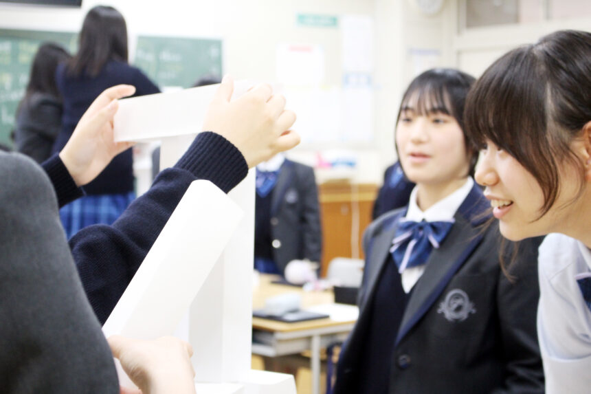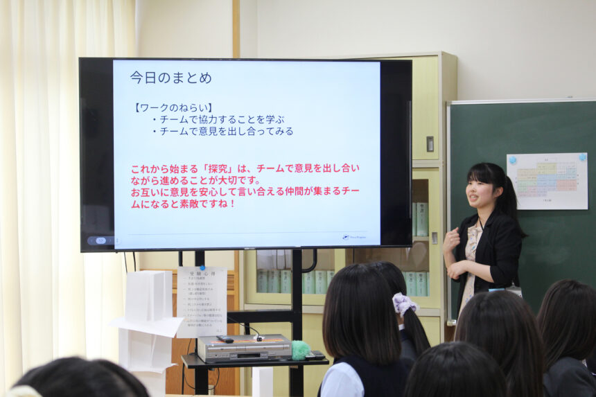 4月17日(金)4・5時限目。1年生全クラス配信で教務部長から総探「ギフト」の目的や調べ学習との違い、カリキュラム等が説明され、活動がスタートしました。1年次は「グループ探究」を通して総探スキルを学びます。今回はメンバーとどのようにタスクを進めていくのか、その練習を「ペーパータワーチャレンジ」で体験します。チームで話し合いながらどうしたら高いペーパータワーを作れるかチャレンジしました。